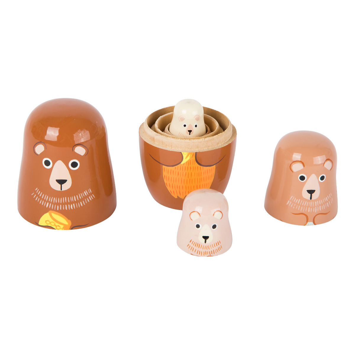 Négy szeretettel festett Matrjoska figura medvecsalád formájában. A kisebb medvék méretüknek megfelelően fokozatosan bújnak egymásba. Ezek a babák könnyen nyílnak középen, ami remek gyakorlat a szem-kéz koordinációhoz és a finommotorikához. A Matryoshka figurák egyedi varázsukat sugározzák, és nagyon aranyosak rájuk nézni – vonzó szemet gyönyörködtető, nagyszerű tanulási potenciállal a gyerekszobába! Főbb jellemzők: 4 medvecsalád figurája fejleszti a szem-kéz koordinációt és a finommotorikát