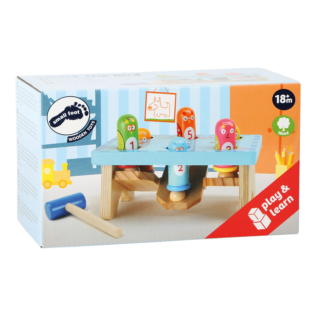 Tömör fából és rétegelt lemezből készült színes kalapácsjáték. Az összes madár az egyik oldalon kalapál, a másikon pedig kikandikál. Szórakoztató és játékos módja a motoros készségek fejlesztésének. Főbb jellemzők: a fajáték fejleszti a gyerekek motoros készségeit
