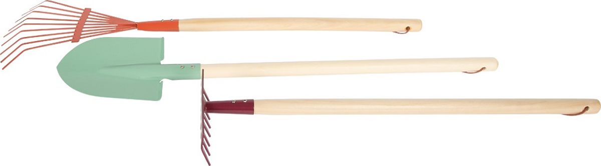 Készlet tartalma: 4 db (2x gereblye, ásó, 2 az 1-ben locsolókanna)