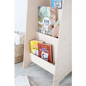 A könyvespolc nem csak praktikus bútor. Átgondolt kialakításának és natúr színének köszönhetően nem csak Montessori stílusú helyiségbe illik. Emellett úgy lett kialakítva, hogy a könyvek a borítóval előre nézve tárolhatók, ami részletesebb áttekintést tesz lehetővé a kis olvasó számára, és olvasásra ösztönöz.