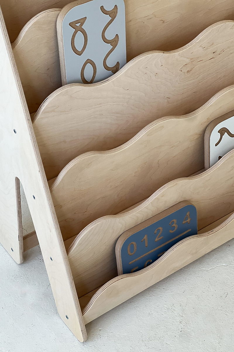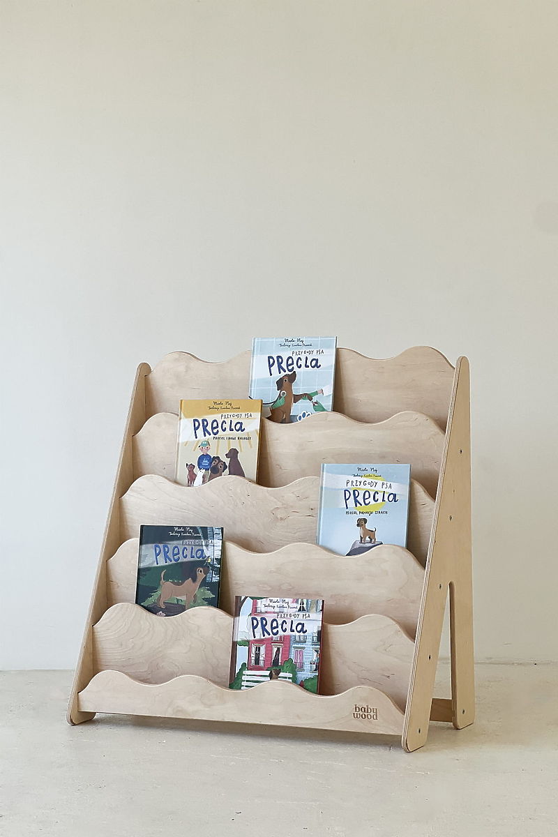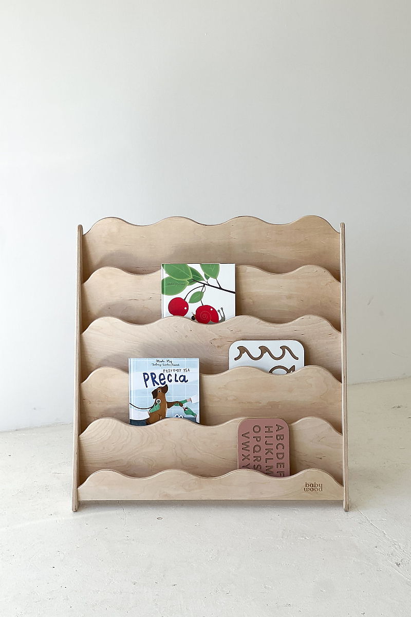 Gyerekbarát könyvespolc hullámos előlapokkal és természetes anyagokból. .. többet