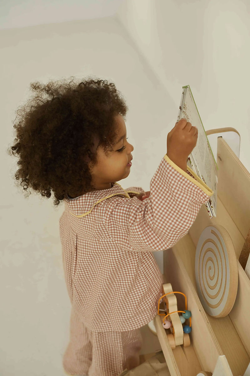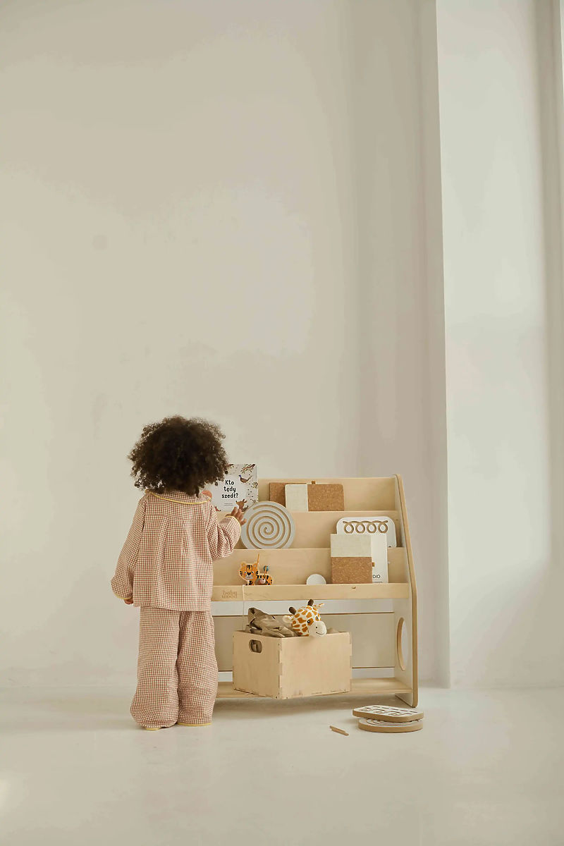 Fa könyvespolc praktikus és esztétikus megoldás a gyerekszoba rendezésére. Kombinálja az egyszerű dizájnt a magas funkcionalitással, és megfelel a Montessori elveknek, amelyek támogatják a gyermek önállóságát. A nyitott kialakításnak köszönhetően a gyermek könnyen hozzáférhet a könyvekhez és játékokhoz, és saját maga helyezheti el azokat a helyükre. A polc lehetővé teszi a könyvek borítóval előrefelé történő elhelyezését, ami különösen ideális a kisebb gyerekek számára, akik még nem tudnak olvasni – kedvenc könyvüket könnyen felismerik a képek alapján. Három könyvespolc különböző méretű könyvek tárolására alkalmas, az alsó rész pedig további tárolóhelyet kínál játékok, puzzle-k vagy társasjátékok számára.