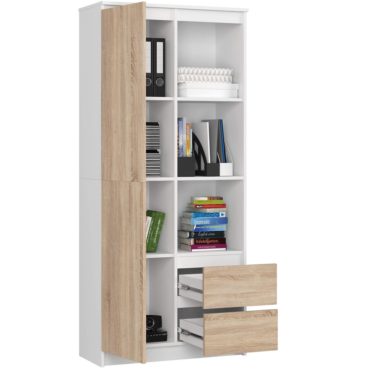 Irodai polc ajtókkal és fiókokkal fehér és sonoma szín kombinációjában.