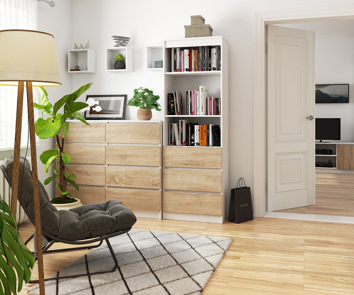 Fehér és Sonoma tölgy színű irodai regál 3 fiókkal és 2 polccal. .. többet