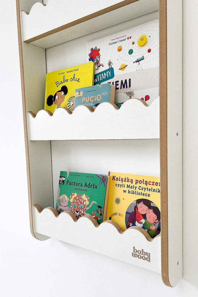 WAVE L polc fehér színben egy praktikus és dekoratív fali könyvespolc, amely segít rendet tartani a gyerekszobában anélkül, hogy helyet foglalna a padlón. Ideális könyvek, apró játékok, fényképek vagy más értékes tárgyak tárolására. A falra szerelésnek köszönhetően a padló szabad marad a játékra és mozgásra, amit a gyerekek és a szülők is értékelnek. Az elegáns és funkcionális design lehetővé teszi a gyermek kedvenc tárgyainak könnyű tárolását és kiállítását. Az lekerekített élek és a minőségi kidolgozás biztonságos használatot biztosítanak még a kisgyermekek számára is.