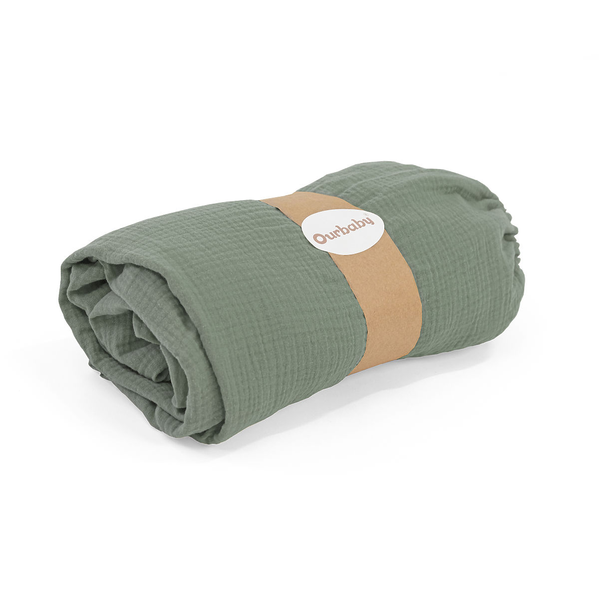 Ourbaby muszlin lepedő gyönyörű zöld színben, kiváló választás azoknak a szülőknek, akik a legjobb kényelmet szeretnék biztosítani gyermeküknek alvás közben. A lepedő puha és légáteresztő muszlinból készült, és ideális az érzékeny bababőr számára.
