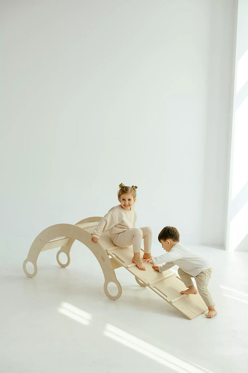 Stílusos fa Montessori hinta csúszdával és létrával természetes színben, amely remekül illik minden gyerekszobába vagy játszószobába. Ez a multifunkcionális készlet nemcsak szórakoztató hintázást biztosít, hanem lehetőséget nyújt a létrán való mászásra és a csúszdán való lecsúszásra is, így természetes módon támogatja a gyerekek motorikus képességeinek, egyensúlyának és erejének fejlődését.