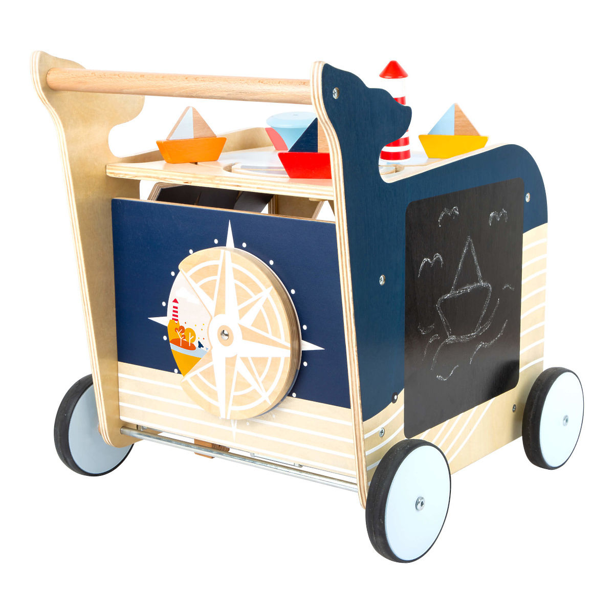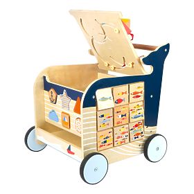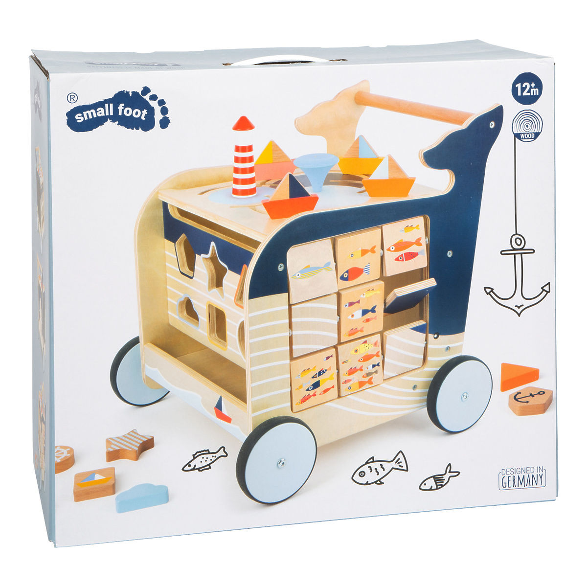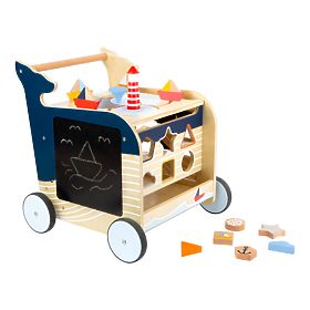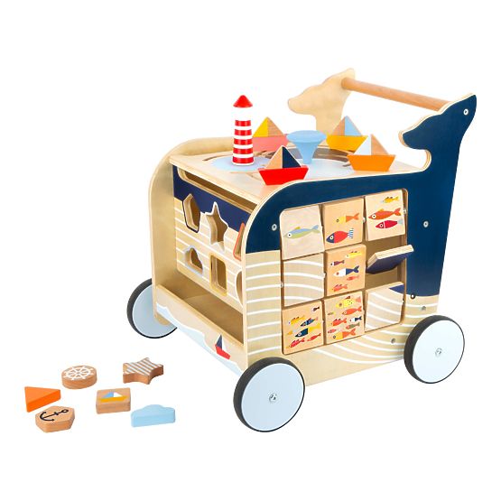 Menjünk felfedezni egy bálnával! Ez a bálna formájú fából készült járóka segít a gyerekeknek az első lépéseik megtételében, ugyanakkor játékokat kínál a motoros készségek fejlesztéséhez. A sétáló ragaszkodik a tengeri világ és állatai stílusához. A sétáló négy oldalán olyan játékokat találsz, mint a formák beszúrása, a képek elforgatása vagy a rajzasztal. A gyerekek megtanulhatnak számolni, meghatározni a világ oldalait vagy megkülönböztetni az évszakokat. A sétáló gumírozott kerekekkel rendelkezik, és egyben csendes és biztonságos. A sétáló tetején nyitható, az ajtón pedig biztonsági eszköz található az ujjak becsípődése ellen. Így az összes kockát tárolhatja benne. A balesetek megelőzésére fékrendszert is talál. Főbb jellemzők: a többfunkciós játék támogatja a játékosságot és a motoros készségek fejlesztését
