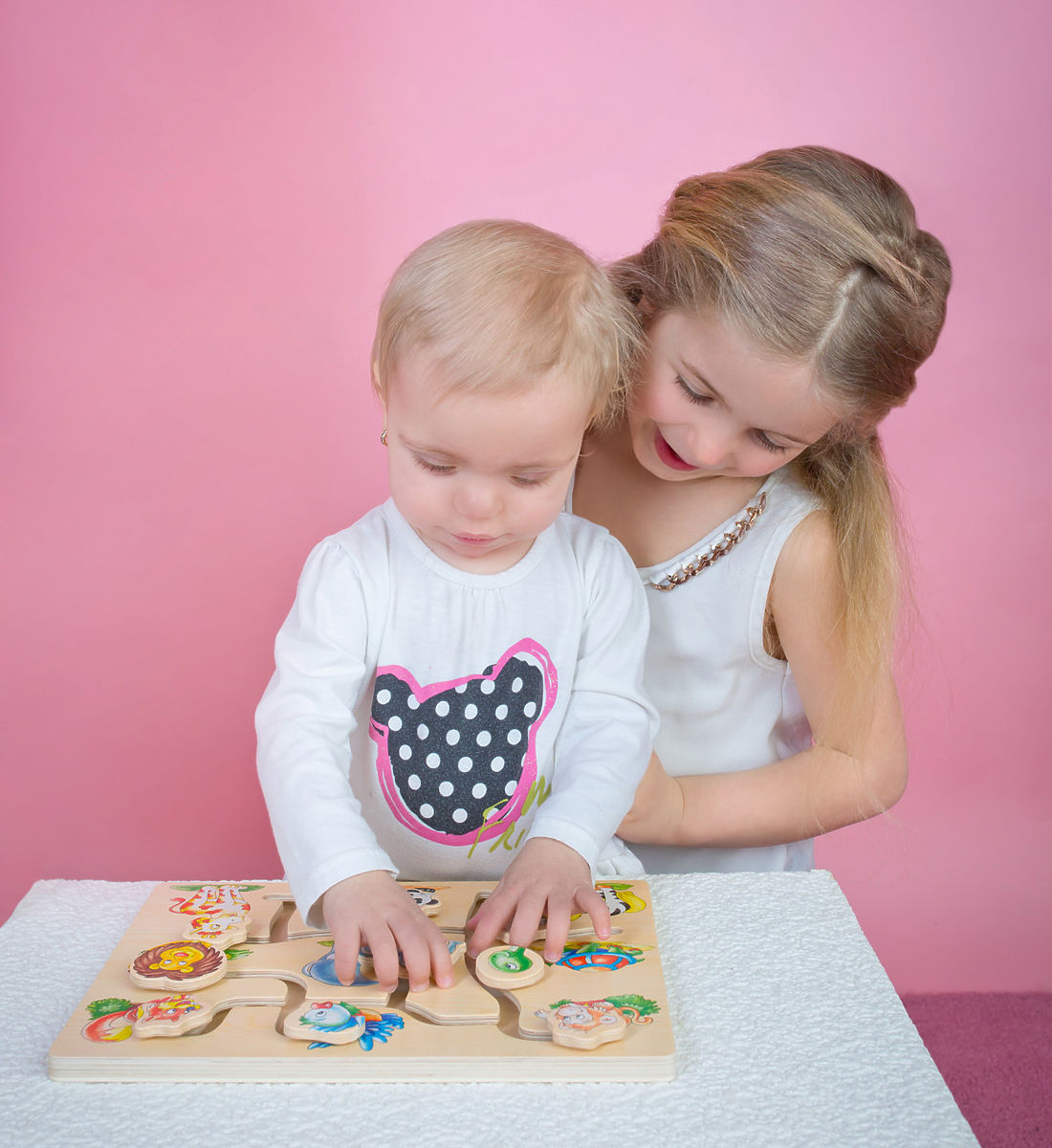 Hogy néz ki a zsiráf, és milyen feje van az oroszlánnak? Az ügyes gyerekek számára gyerekjáték lesz helyesen összepárosítani az állatokat. A játék tartós, erős rétegelt lemezből készült.   Főbb jellemzők: tartós fa kivitel