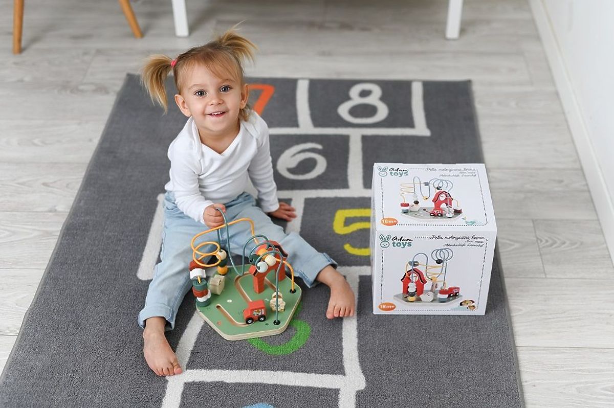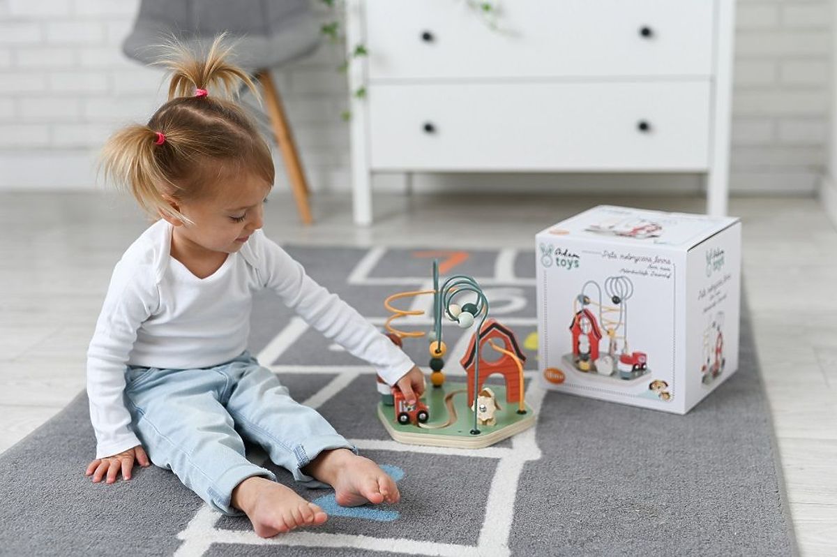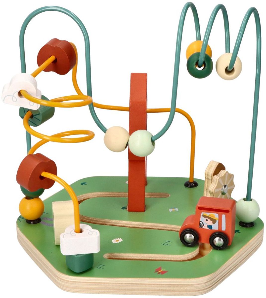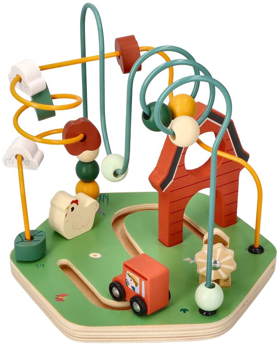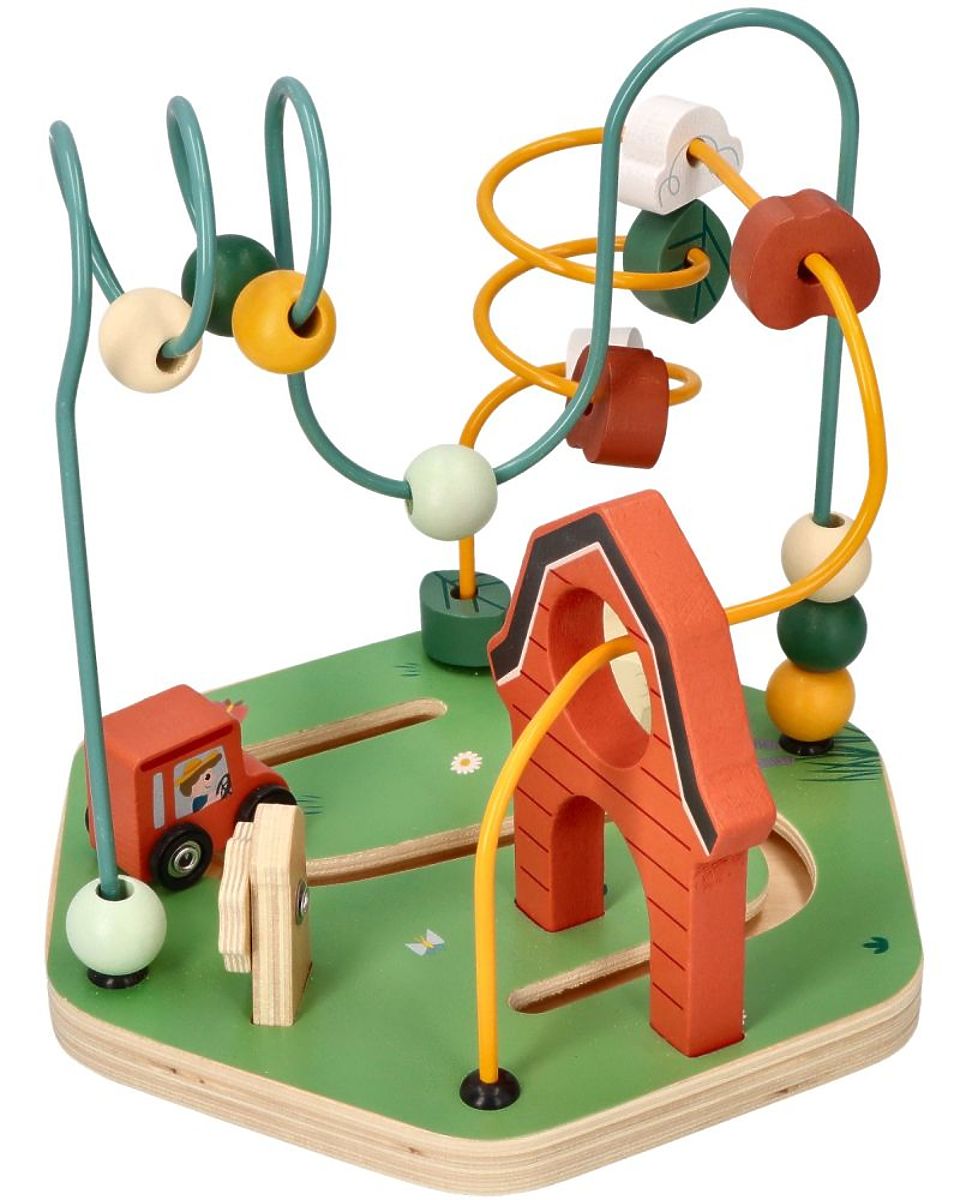 Két színes fémrúdon (zöld, sárga) találhatók fa gyöngyök, amelyeket a gyermek szabadon mozgathat, ezzel fejlesztve az ujjak és a kezek mozgásának pontosságát. A hurkokon összesen 14 fa kocka és gyöngy található. Az egyik hurkon akadályok vannak, amelyek kissé megnehezítik a gyöngyök mozgatását. Ezenkívül a játék alapja egy pályát képez, amelyen az új tulajdonos – ahogy az egy farmhoz illik – traktorral járhat, és őrizheti a birtokát. Összességében egy nagyon színes és örömteli játékot alkot, amellyel a gyermek biztosan kellemes időt tölt el.