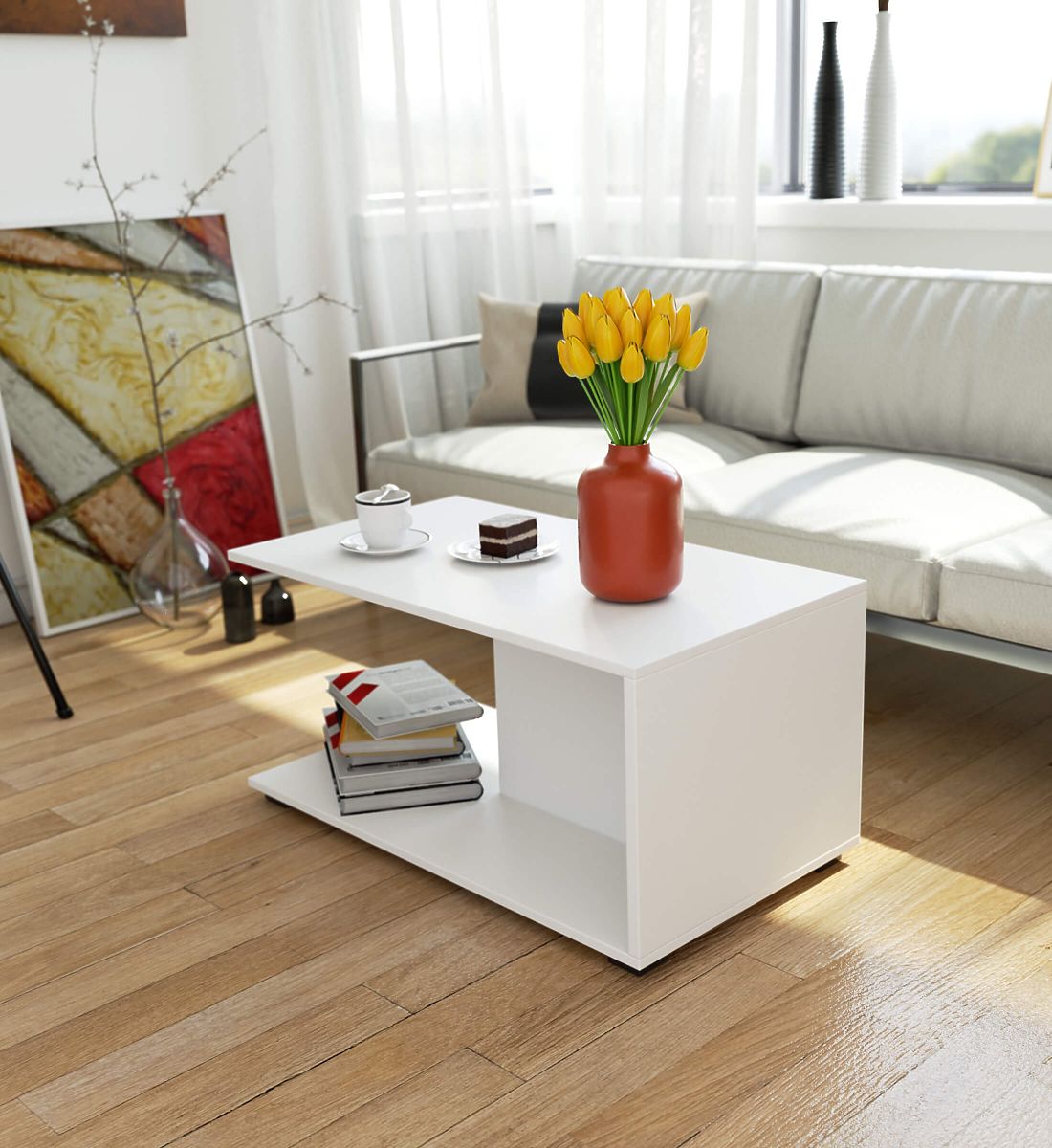 A fehér konferencia asztal sikeresen ötvözi a funkcionalitást és a vizuális vonzerőt. A bútor illik mind a klasszikus, mind a modern stílusú nappalikba. A 90 cm-es konferencia asztal kiváló minőségű laminált lapból készült, amely kopásállóvá teszi. Az asztal nedvesen is gyakran tisztítható anélkül, hogy a lapja sérülne. Az asztal kis mérete biztosítja, hogy alkalmas legyen mind kis, mind nagy nappalikba. Az asztalnál kényelmesen élvezheti a kávét és a teát, olvashat könyveket és magazinokat, vagy szabadidejét társasjátékokkal töltheti. A nappali asztal egy további alsó polccal van felszerelve, amely a felső lap méretével megegyezik, jelentősen növelve annak funkcionalitását. A polc használható magazinok vagy lemezek tárolására, vagy üresen hagyható a dolgok, például kézimunkák könnyű elhelyezésére. A konferencia asztal dekoratív célokra is használható, például dizájn lámpa vagy virágkompozíció elhelyezésével.