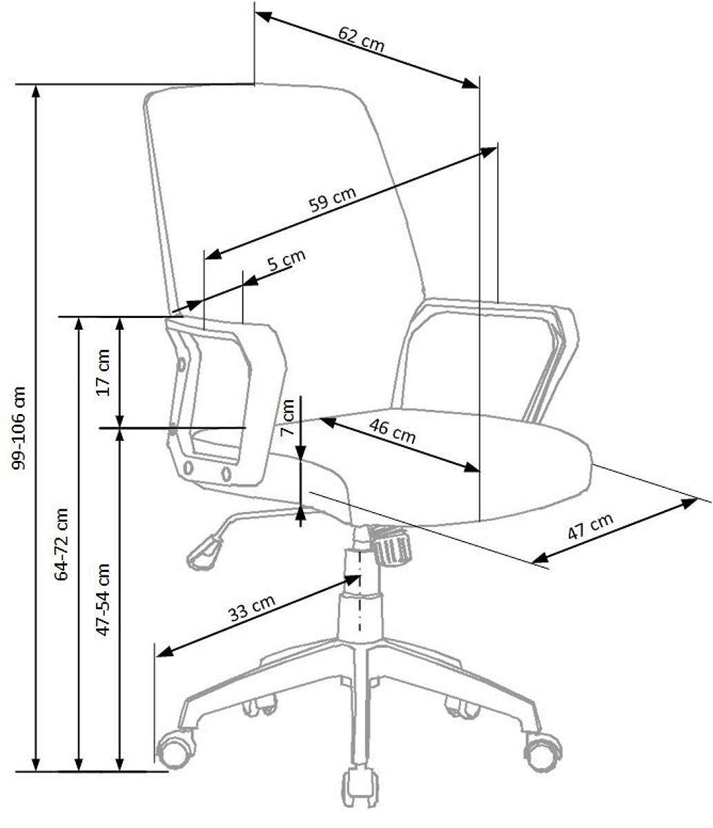 A szék szilárd szerkezetű, fehérre edzett polipropilénből készült, és légáteresztő kárpitszövettel van kárpitozva. TILT mechanizmussal rendelkezik, aminek köszönhetően a gázemelő segítségével könnyedén beállíthatja az ülés magasságát. A kényelmes ülést praktikus kartámasz és öt műanyag kerék garantálja.