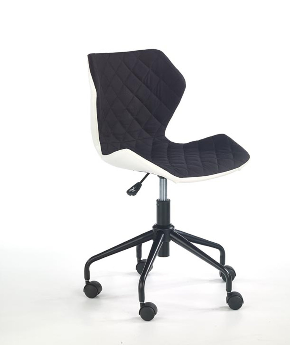 A szék belülről steppelt kárpitozással, kívül pedig kiváló minőségű ökobőrrel van kárpitozva. Az egység elegáns fehér-fekete színben készül. A kényelmes ülést öt puha műanyag kerék és a háttámla egyedi formája garantálja. Az ülés magassága 10 cm-en belül állítható.