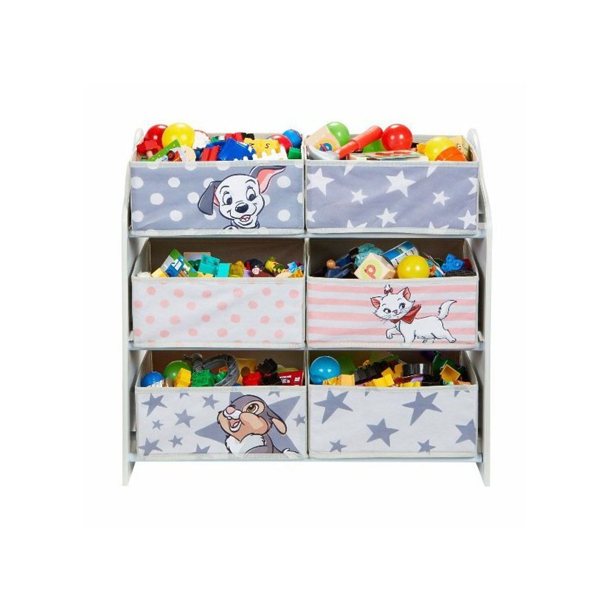 A klasszikus Disney Studios mesék 3 hősének motívumával készült színes játékszervező. A 101 kiskutya dalmata kölyökkutyusa, Maria cica a Macska arisztokraták című rajzfilmből és az aranyos Toppancs nyuszi a Bambi című kedves meséből. Mindhárom hős háttere szürke, fehér és rózsaszín.