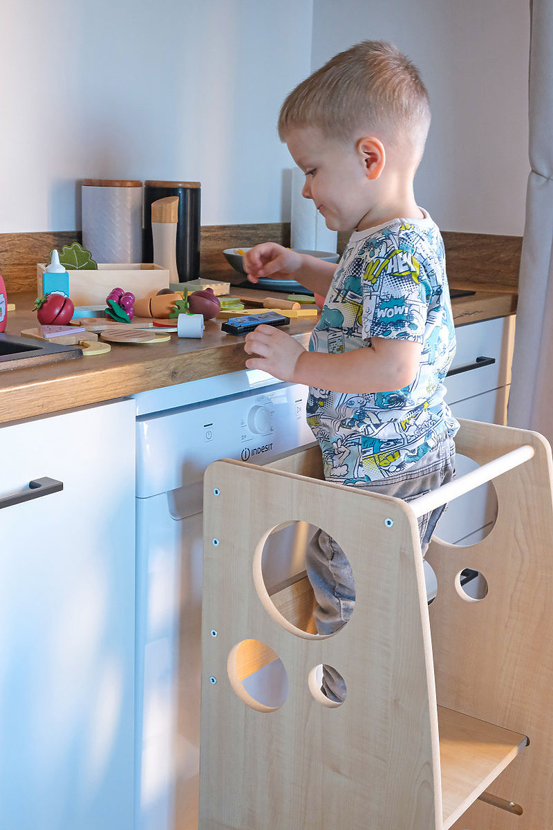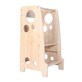 Gyermek montessori tantorony barna kivitelben, kör alakú kivágásokkal. Megbízható és praktikus segítő, amely fejleszti a kreativitást, a motoros készségeket és .. többet