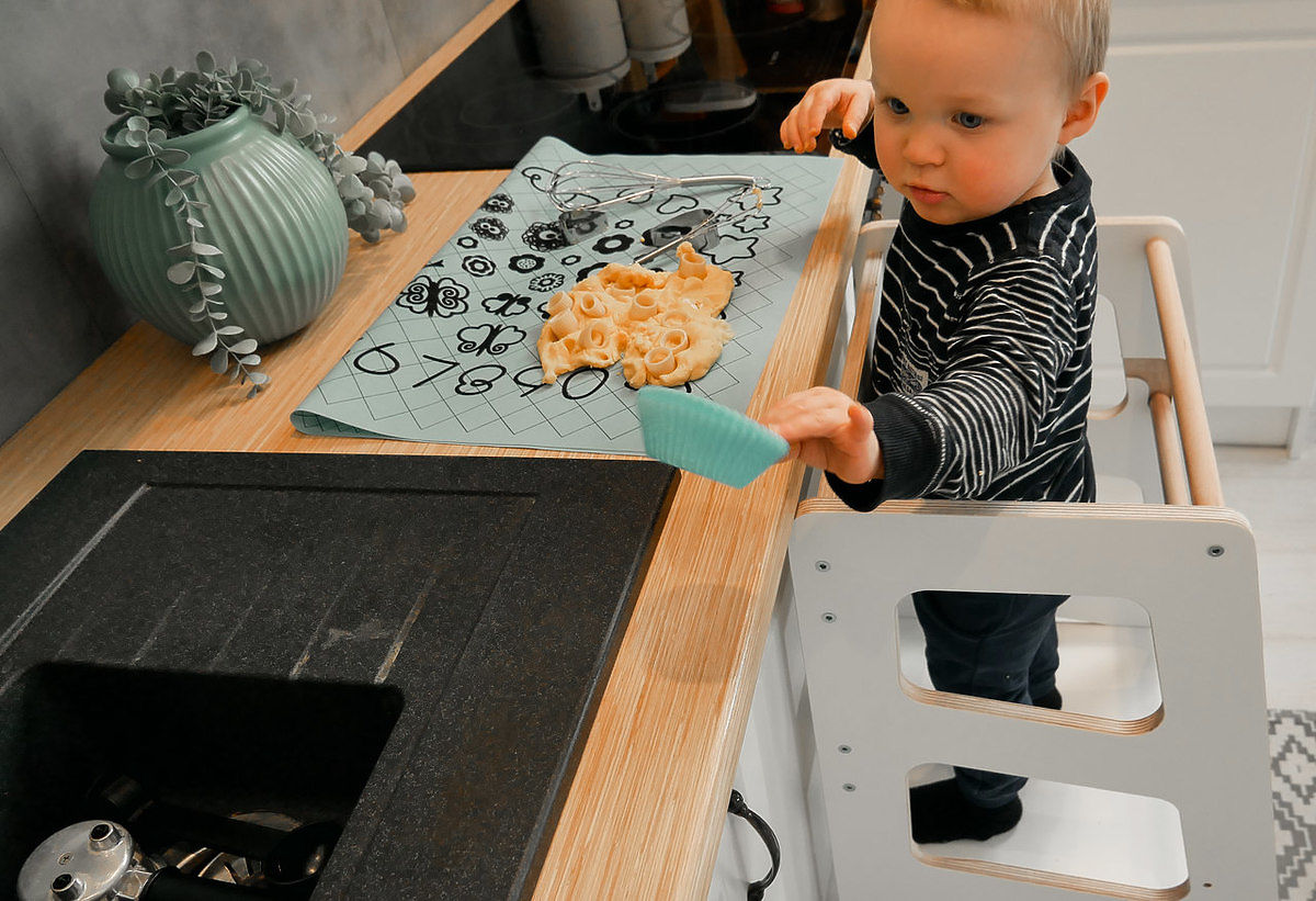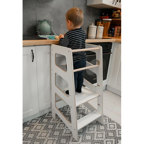 A Sara Scandi gyermek montessori tantorony fehér színben megbízható és praktikus segítőtárs, amely fejleszti a kreativitást, a motoros készségeket és pozitív hatással van a gyermek általános fejlődésére és szocializációjára is.
