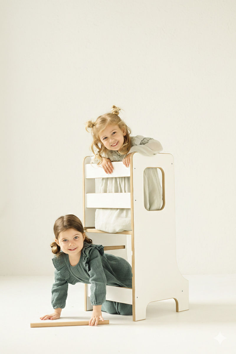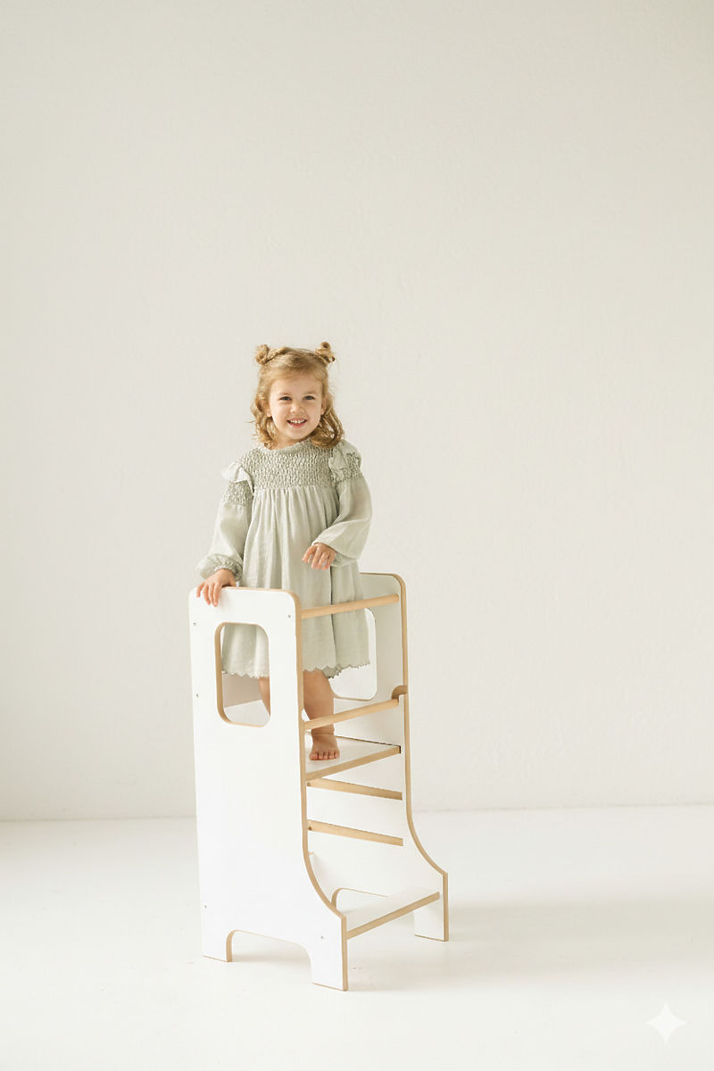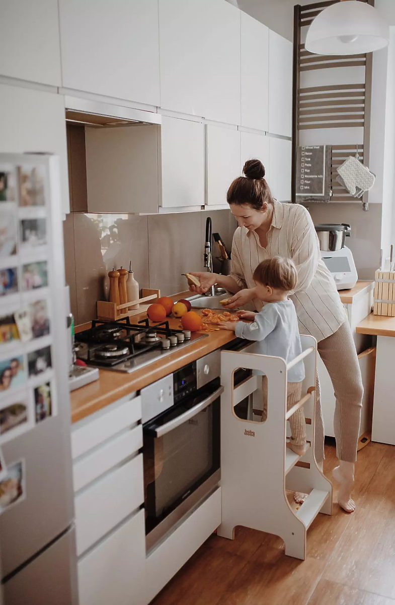 A SLIM tanulótorony fehér színben ideális választás azon szülők számára, akik szeretnék gyermekeiket biztonságosan bevonni a mindennapi háztartási tevékenységekbe, és lehetővé tenni számukra, hogy aktívan felfedezzék a körülöttük lévő világot. Átgondolt kialakításának köszönhetően támogatja az önállóságot, a kreativitást és a motorikus képességek fejlődését, segítve a gyerekeket abban, hogy természetes módon szerezzenek új tapasztalatokat. A közös időtöltés a főzésnél vagy más tevékenységeknél így szórakoztató és értékes pillanatokká válik. A SLIM verzió karcsú kialakítása elegáns megjelenést biztosít, és nem foglal feleslegesen sok helyet, mégis stabil és biztonságos marad. A gyerekek önállóan felmászhatnak a toronyba és biztonságosan lemászhatnak róla, ami erősíti önbizalmukat és függetlenségüket.
