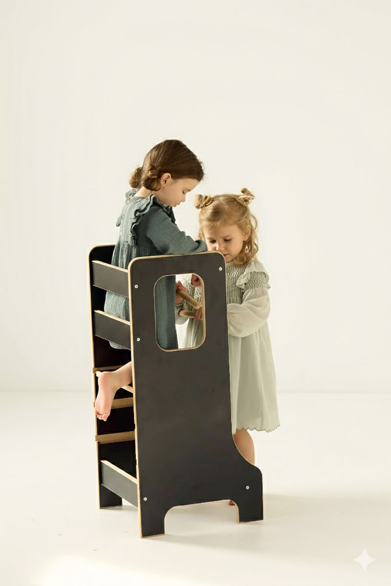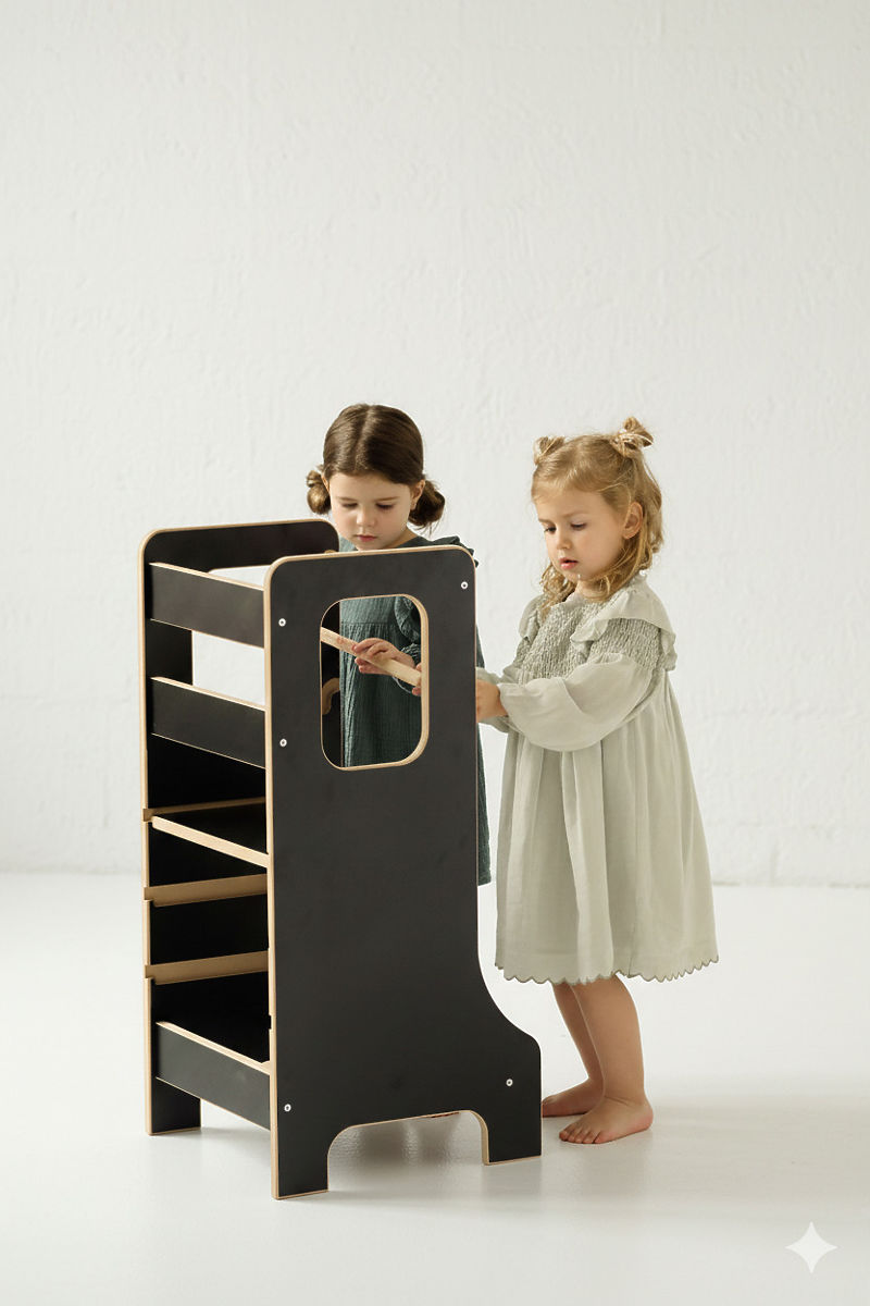 SLIM tanulótorony fekete kivitelben, stílusos és praktikus segítőtárs azoknak a családoknak, akik szeretnék a gyerekeket biztonságosan bevonni a mindennapi háztartási tevékenységekbe. Lehetővé teszi a gyerekek számára, hogy megfelelő magasságban álljanak, figyeljék a körülöttük zajló eseményeket, és aktívan részt vegyenek a szokásos tevékenységekben. Ugyanakkor támogatja az önállóság, a motorikus készségek és az önbizalom fejlődését. A karcsú kialakításnak köszönhetően a torony könnyen beilleszthető a modern belső terekbe, és nem foglal fölöslegesen sok helyet. A stabil szerkezet és az átgondolt biztonsági elemek kényelmes és biztonságos használatot biztosítanak.