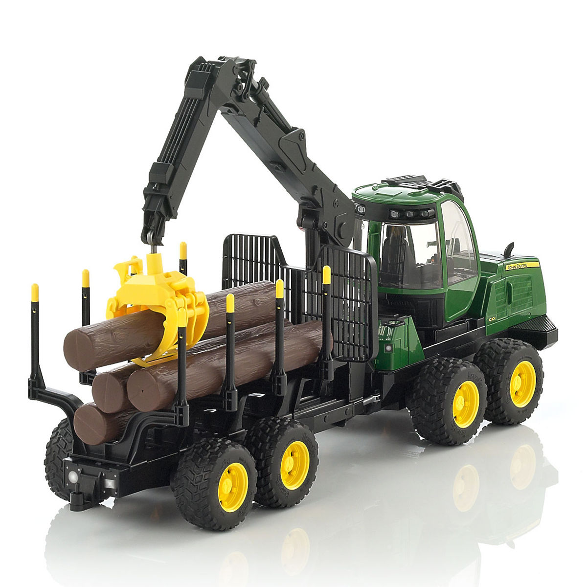 A JOHN DEERE 1210E erdészeti traktor pótkocsival és rakodó karral nyitható ajtókkal és motorháztetővel rendelkezik. A kabin 360°-ban forgatható, és kiváló minőségű törhetetlen polikarbonáttal van kitöltve. A faanyag rakodására szolgáló funkcionális rakodó markolóval szintén 360°-ban forgatható. Ezenkívül csúsztatható oldalfalakkal, négy lengőtengellyel rendelkezik, amelyek követik a nehéz erdei terepet. Az erdészeti traktor végén további vontatóberendezés található egy másik pótkocsi csatlakoztatásához. A jármű 4 darab rönkkel van felszerelve. Németországban készült, kiváló minőségű anyagokból. Fő jellemzők: nyitható ajtók és motorháztető, forgatható kabin és markoló 360°-ban, négy tengely, vontatóberendezés, 4 darab rönk, Németországban készült.