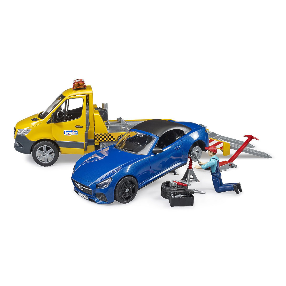 A népszerű Mercedes-Benz Sprinter haszongépjármű részletes modellje, amely vontatóautóként van kialakítva, akkumulátoros világítótoronnyal rendelkezik fény- és hanghatásokkal (az elemek a csomag részét képezik). Felszerelt rámpával, kihúzható sínekkel és ékekkel, valamint más funkcionális részletekkel, nyitható ajtókkal, oldalsó szekrényekkel és levehető csörlőkonzollal. A rakomány része egy valósághű sportkabriolet modell, amely levehető tetővel és cserélhető kerekekkel rendelkezik. Mindkét autó belső tere teljesen felkészült a BWORLD figurák elhelyezésére. Kínálatunkban további, a modellhez illő kiegészítők és bővítések is megtalálhatók. Németországban készült, kiváló minőségű anyagokból. Főbb jellemzők: világítótorony fény- és hanghatásokkal (3×LR44 elem a csomag része), sportautó levehető tetővel és cserélhető kerekekkel, rámpa kihúzható sínekkel és ékekkel, nyitható ajtók, nyitható szekrények, levehető csörlőkonzol, kompatibilitás a BWORLD kiegészítőkkel, Németországban készült.