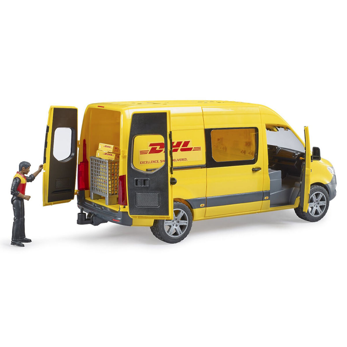 A Mercedes-Benz Sprinter járművek a kis teherautók kategóriájában a legsikeresebb modellek közé tartoznak. A modell újonnan kifejlesztett, valósághű tolóajtókkal lep meg. A DHL verzió sofőrfigurával és kiegészítőkkel, például raklappal és csomagokkal érkezik. Az autó teljes belső tere valósághű kidolgozást kínál, amely kompatibilis a BRUDER BWORLD figurákkal. Németországban készült, kiváló minőségű anyagokból. Főbb tulajdonságok:autó csörlőhöz való vonóhoroggal, figura, raklap és 4 csomagméretes rakodótérnyitható oldalsó és hátsó ajtókkompatibilitás a BWORLD figurákkalNémetországban készült