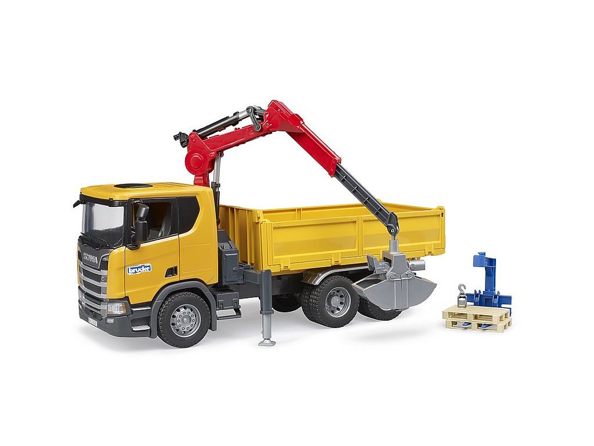 Mint a többi Scania modell, ez is tartósságával és robusztusságával tűnik ki. A teherautó nyitható ajtókkal, lehajtható tükrökkel rendelkezik, és alkalmas beltéri és kültéri játékra egyaránt. Az első fülke kényelmes munkaterületet biztosít a bworld világ figuráinak. A fülke mögött egy 360 fokban forgatható teleszkópos rakodókar található. A könnyebb rakodást és kirakodást lehajtható oldalfalak és rakodóplatform segítik. A jármű stabilitását támasztólábak biztosítják. A csomag két raklapot, raklapvillát és markolókanalat tartalmaz. Főbb jellemzők: lehajtható tükrök, nyitható ajtók, 360°-ban forgatható kar, lehajtható oldalfalak, támasztólábak, lehajtható platform, alkalmas beltéri és kültéri játékra, kompatibilis a BRUDER bworld figurákkal, Németországban készült, 4 éves kortól ajánlott.