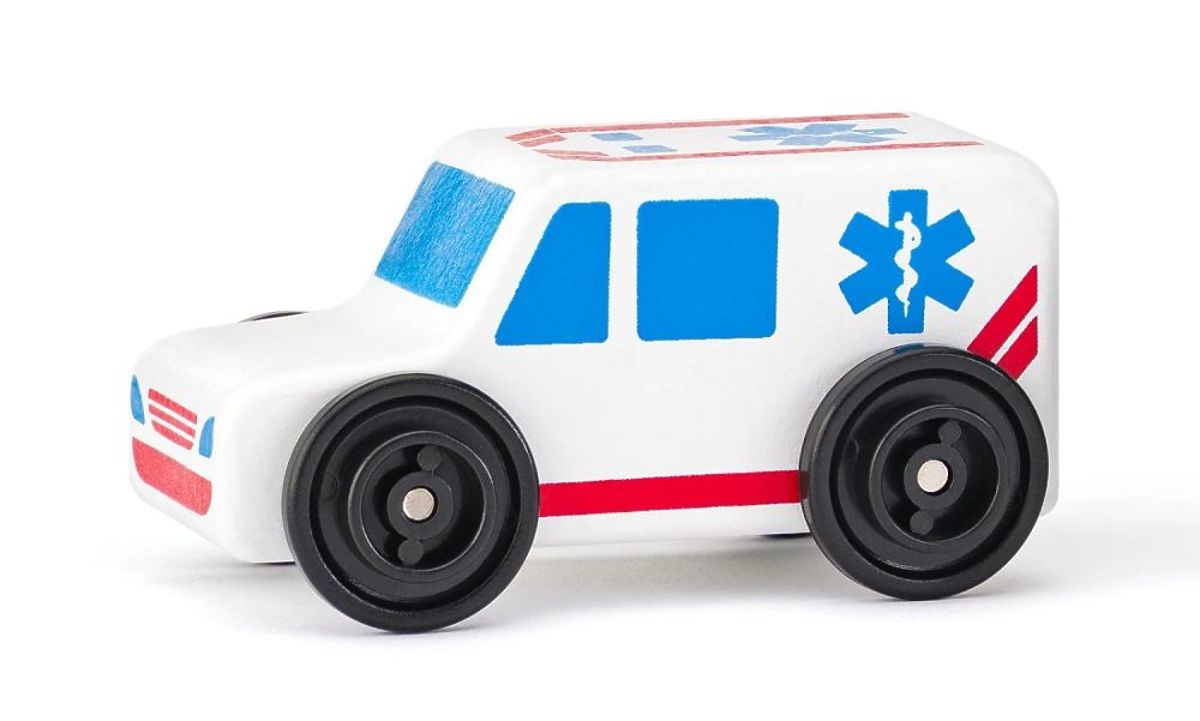 A gumikerékkel ellátott fa járművek ideális kiegészítői a fa vonatoknak és nem csak azoknak. A készletben található egy tűzoltóautó, mentőautó, taxi, postai .. többet