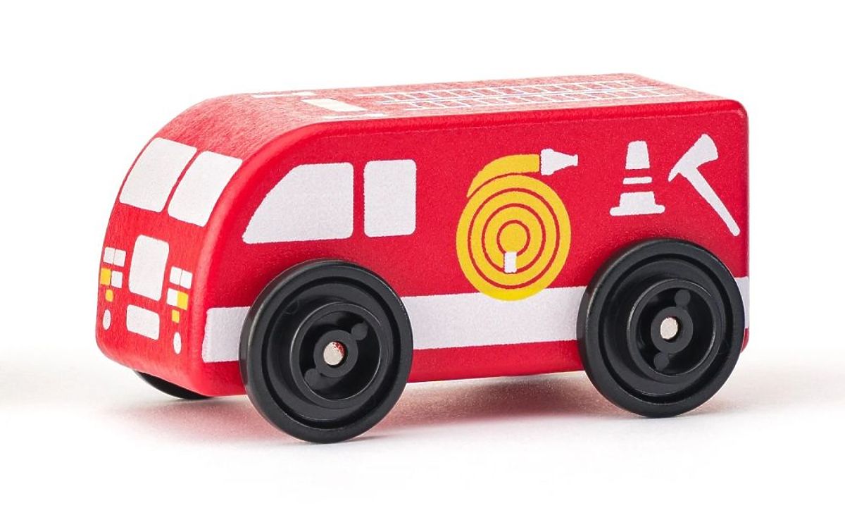 A gumikerékkel ellátott fa járművek ideális kiegészítői a fa vonatoknak és nem csak azoknak. A készletben található egy tűzoltóautó, mentőautó, taxi, postai jármű és busz – mindegyik készen áll az akcióra! Könnyű és tartós szerkezet, amely a kis kezekhez igazodik, biztonságos és könnyen kezelhető. Fejleszti a képzelőerőt, támogatja a motoros készségeket és ösztönzi a kreatív játékot. A legtöbb fa vonatkészlettel kompatibilis.