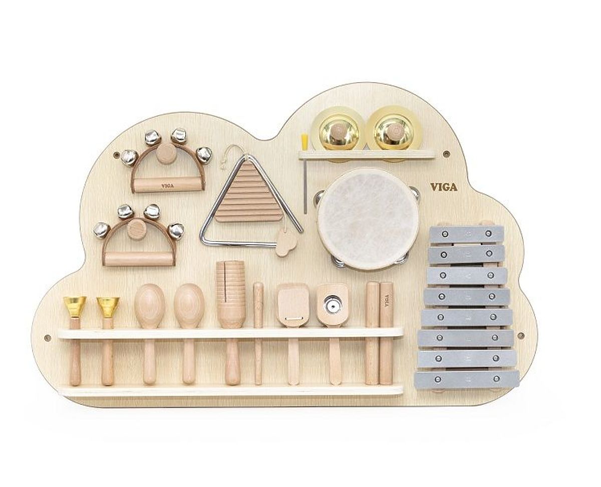 A gyerekek gyorsan érdeklődést mutatnak a tartalom iránt, és a panel motívuma segít rendet tartani. A panelen 4 tartó található a szerszámok felakasztására, egy felső polc, amelyre 2 tányér helyezhető el ütővel, és egy alsó polc kivágásokkal, amelyre a szerszámok függőlegesen helyezhetők el. A jobb oldalon van hely a xilofon elhelyezésére.